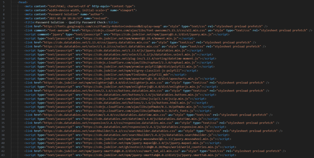 Please note that the ONLINE switch you see in the examples has nothing to do with the requirement of being online to run the password quality scan. It simply instructs PSWriteHTML to use CDN for JS and CSS libraries. If the ONLINE switch is skipped, it bundles all required CSS/JS code into a single HTML, making the report about 3MB bigger. This means instead of CDN links: