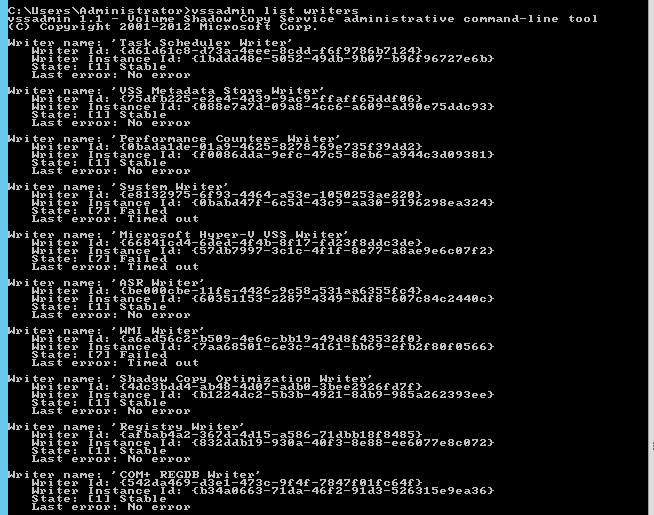 At this point, it was clear we need to investigate VSS. First steps involved checking if VSS writers are in good condition.