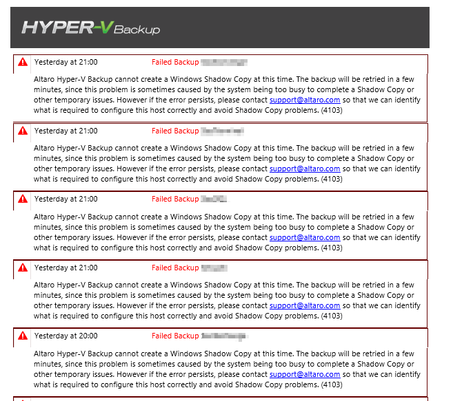 Altaro Hyper-V Backup cannot create a Windows Shadow Copy at this time. The backup will be retried in a few minutes, since this problem is sometimes caused by the system being too busy to complete a Shadow Copy or other temporary issues. However, if the error persists, please contact support@altaro.com so that we can identify what is required to configure this host correctly and avoid Shadow Copy problems. (4103)