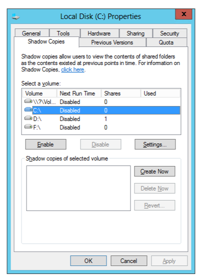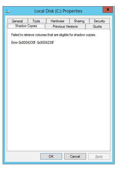 This can also be verified by right clicking any drive in **Explorer, **going into Properties and under Shadow Copies there should be a nice table with all VSS-enabled drives. Unfortunately again it confirms there's a problem with VSS.
