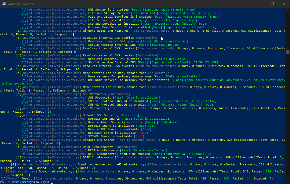 Some months ago, I saw on Twitter how Bill Kindle wrote Pester based Active Directory test. If you don't know Pester, it's a test framework for PowerShell scripts. He used it in the non-conventional way of testing infrastructure with it. It was a bit eye-opener for me even thou I know some people have done similar things before. At that time, I took his code, done some improvements, few small adjustments, and released to PowerShell Gallery under PesterInfrastructureTests name. This gave me the ability to use it freely without the need to copy/paste any code. I was using it for confirming that my or my Clients Active Directory works correctly. It covered some basic tests, but it was handy. It made me forget about the AD Replication Status Tool, and I could quickly check if everything is running correctly after Windows Updates. Let's see how PesterInfrastructureTests looks like and what it does, shall we? All we have to do is install it using Install-Module which downloads and install PesterInfrastructureTests. After that, we run a single command that targets Active Directory Forest scanning all Domains and all Domain Controllers doing some basics tests.