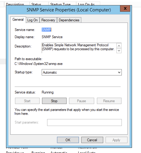 To be able to configure SNMP Service we need Agent Tab, Traps Tab, Security Tab available when opening the SNMP Service properties.